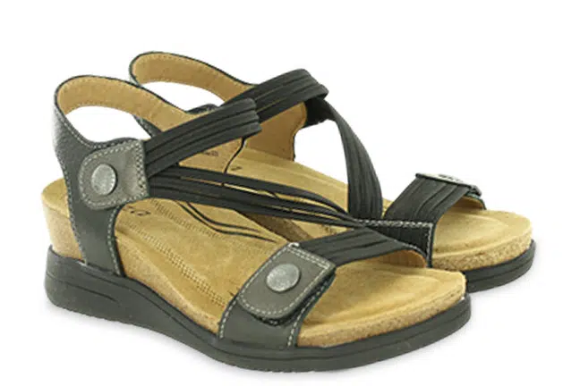 Chic, supportive, and ready to go—the Saint Sandal by Biza is your new favorite travel companion. With sleek elastic and leather uppers, cushioned memory foam, and an EVA-cork wedge, it’s made for walking in style. Dress it up or down for versatile wear anywhere you go. 4034-004