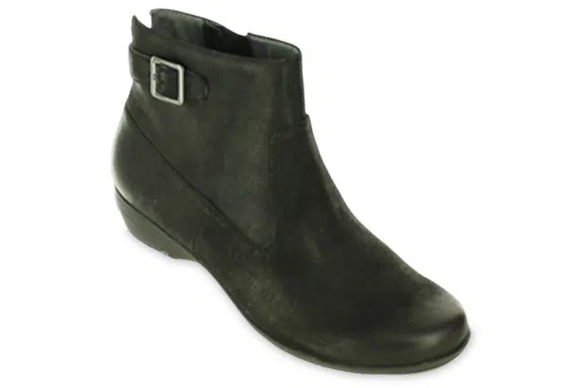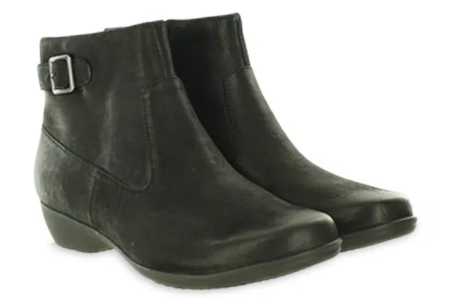 From work to weekend, the Finnley bootie delivers effortless style and all-day comfort. Crafted from high-quality leather, it features Dansko Natural Arch® technology for superior support and cushioning. The removable EVA footbed accommodates most orthotics, while the leather and textile lining helps control odor. A rubber outsole ensures durability, and the inside zipper allows for easy on and off. With a sleek, versatile design, Finnley is the perfect go-to bootie for any occasion. 5513-360200 in black.